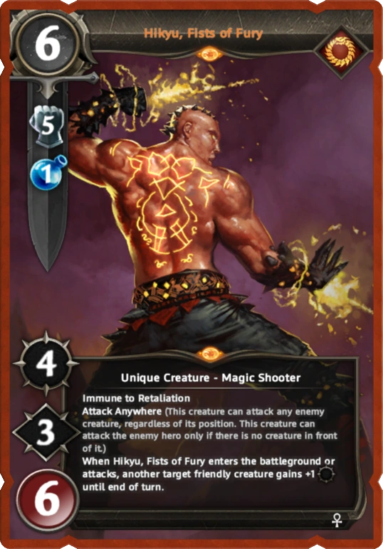 When Hikyu, Fists of Fury enters the battleground or attacks, another target friendly creature gains +1